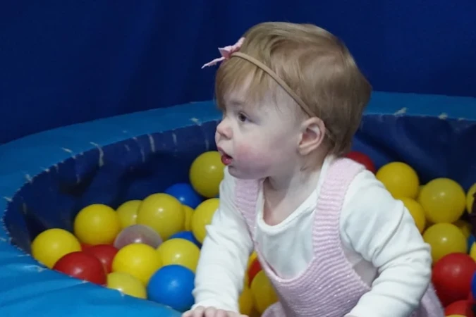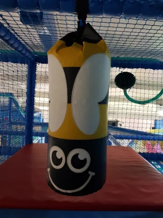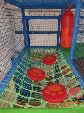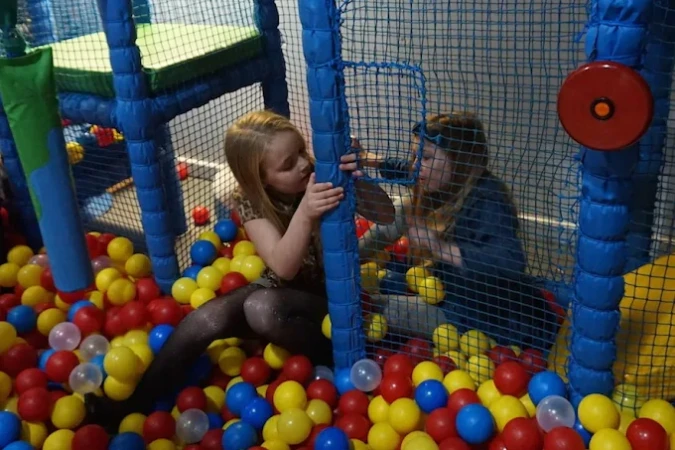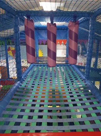 The centre features a multi-tier soft play structure with dedicated areas for babies, toddlers, and juniors. The baby area includes a sensory floor and blocks, the toddler area (18 months–3 years) offers age-appropriate climbing and sliding, and the junior area (3–11 years) includes a twin lane racing slide, ball swing, climbing wall, and ball cannons. An on-site café sits within the play centre, allowing parents to enjoy food and drinks while watching their children play.