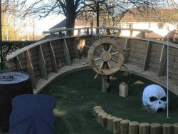 Rascal Bay at Chelmsford, the Course Designed in Sweden, the adventure encounters Pirates, Cannons, an Octopus, Snakes, Skulls, a Cannibal’s cooking pot, a cave ,Rocks, a Volcano that eruptes, Dinosaurs, Waterfalls, Dinosaur Eggs, a Treasure Chest, Crocodiles and two Rafts that the kids will love